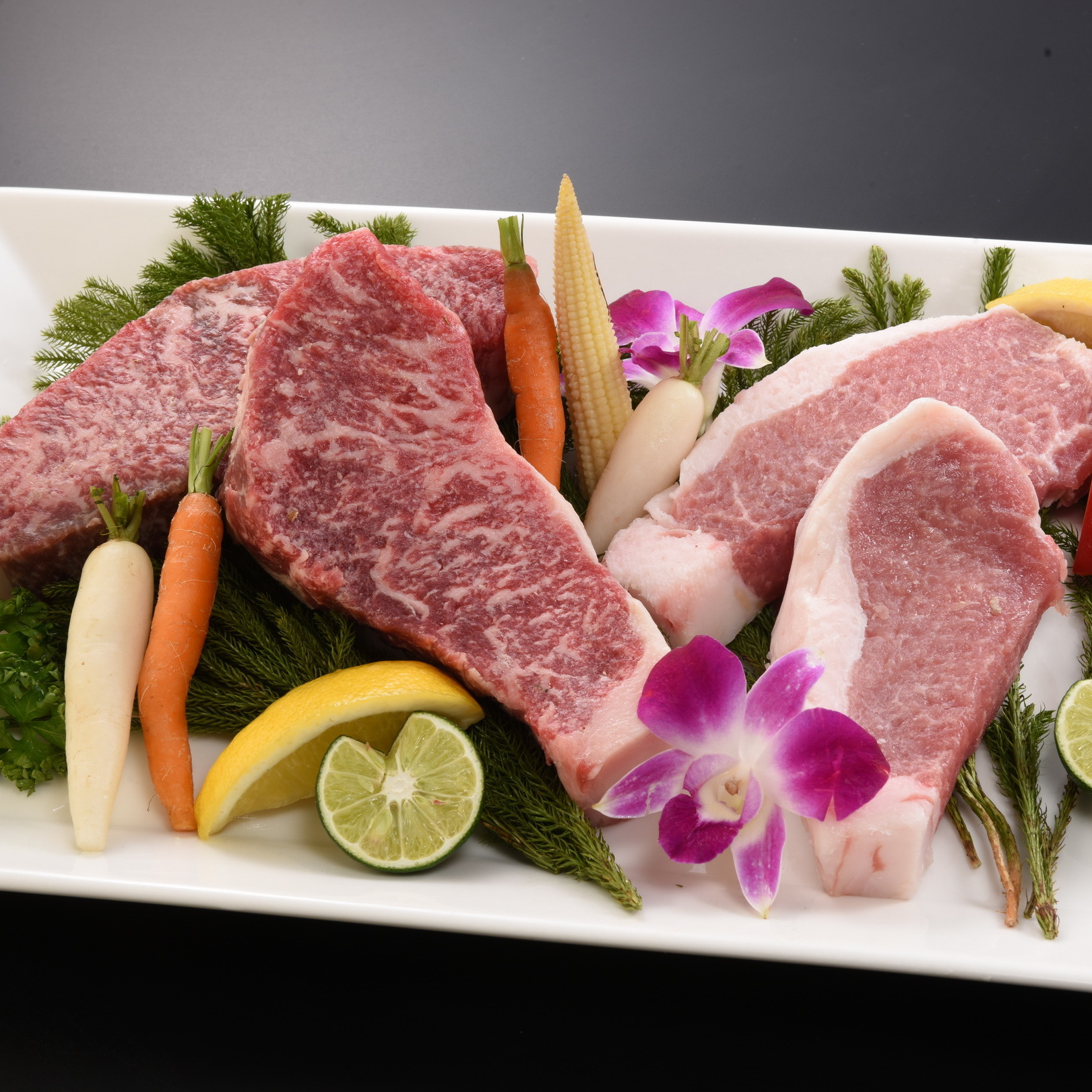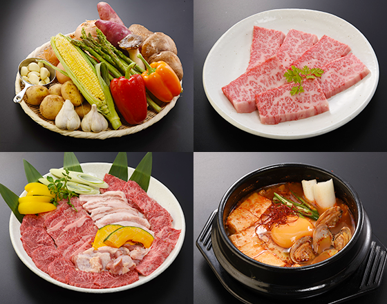 牛肉は和牛A5にこだわり、豚肉は北海道産の十勝黒豚他銘柄豚を使用、鶏肉は鳥取県産の大山鶏をご提供。